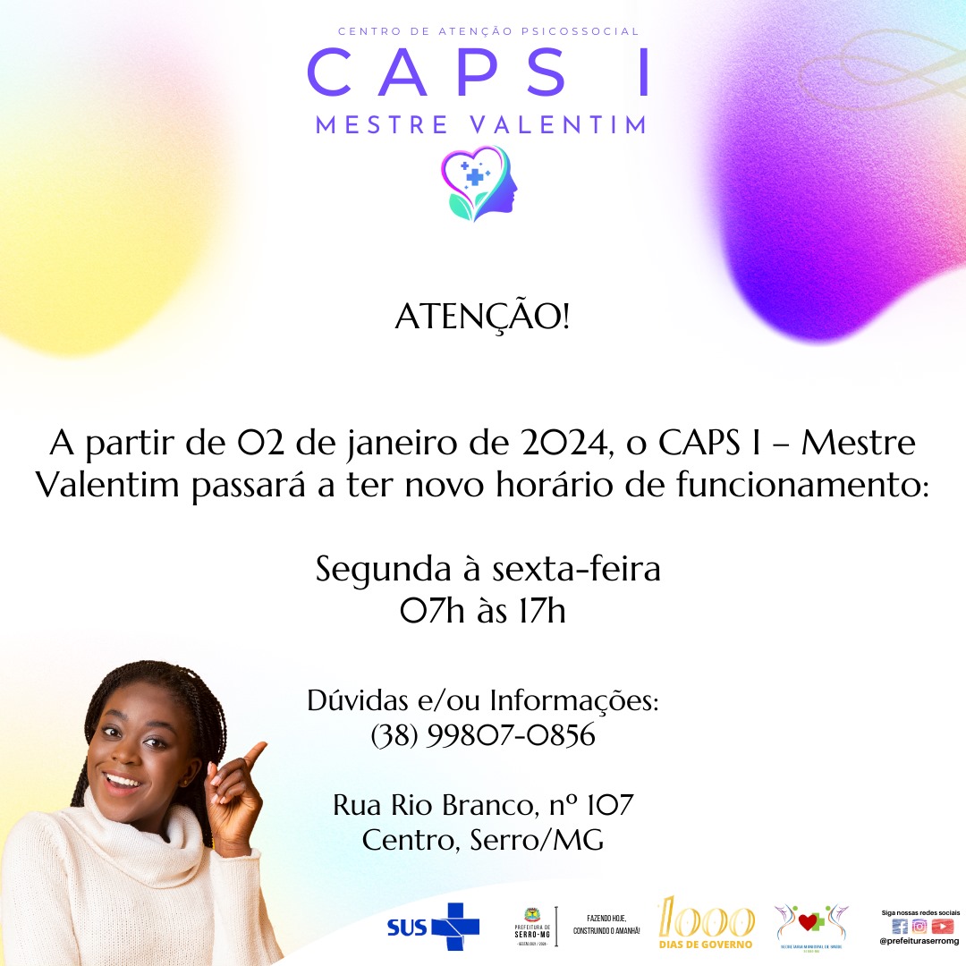 Novo Horário de Funcionamento do Caps I Mestre Valentim