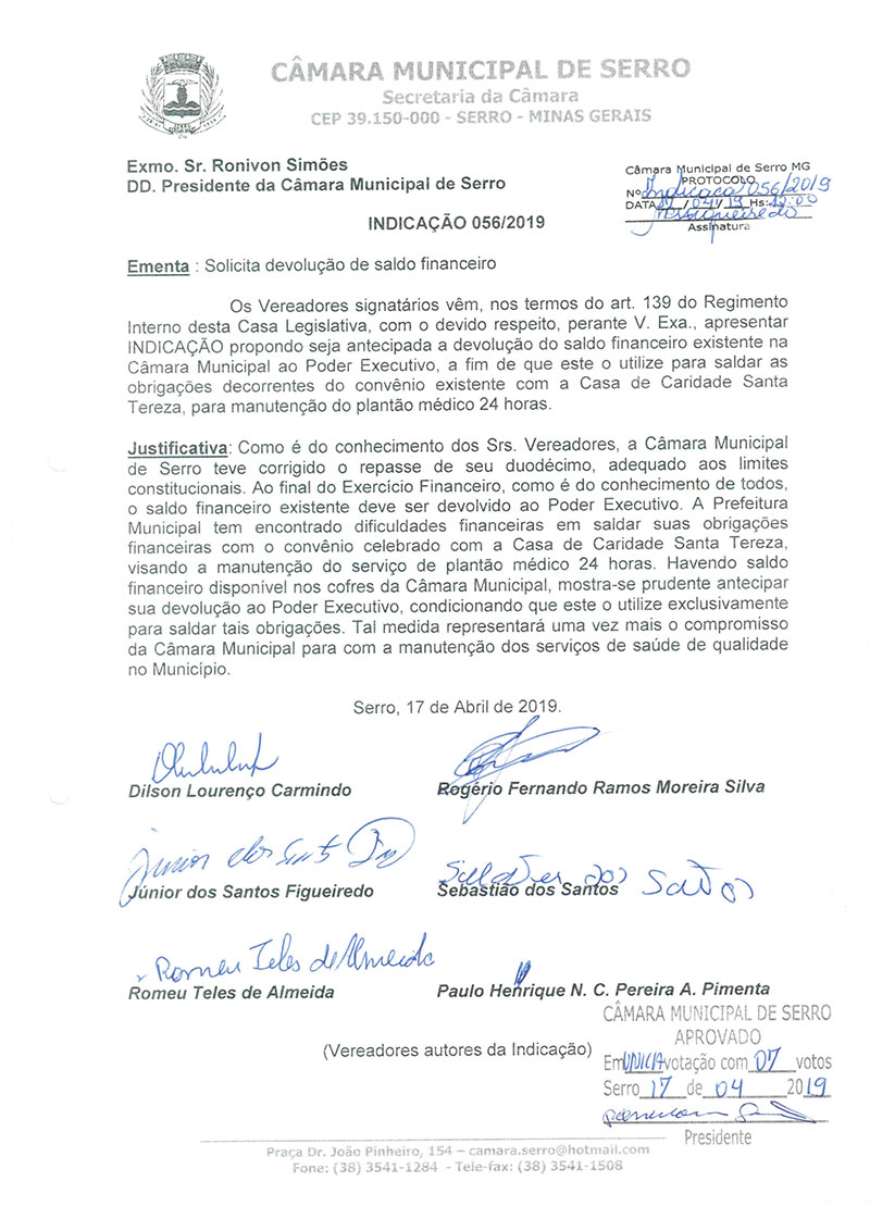 Câmara de Vereadores do Serro disponibiliza R$ 470.000,00 de seu saldo financeiro, dando exemplo de compromisso social, civismo e cidadania, e reflete diretamente na área da saúde serrana