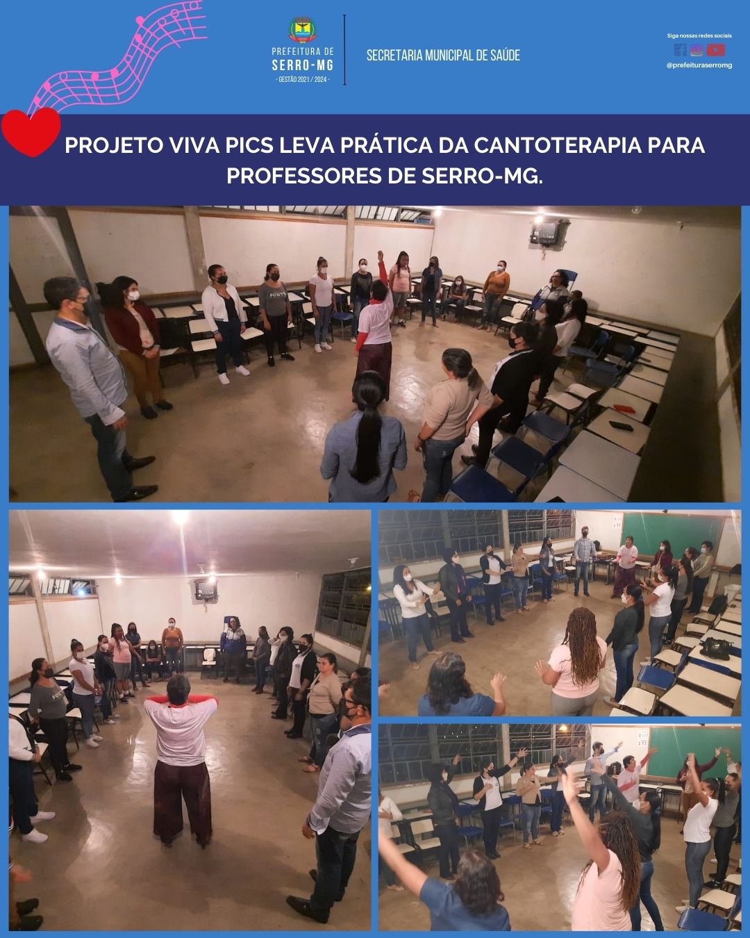 Com a Cantoterapia, o VIVA PICS leva aos professores do município de Serro técnicas e orientações acerca da prevenção de distúrbios vocais e do aparelho auditivo, trabalhando musculaturas importantes para a saúde da respiração, saúde vocal e expressão, tanto da fala como do canto, alcançando os principais objetivos do Projeto, que é desenvolver a saúde mental, física e o bem-estar geral dos profissionais e cidadãos.