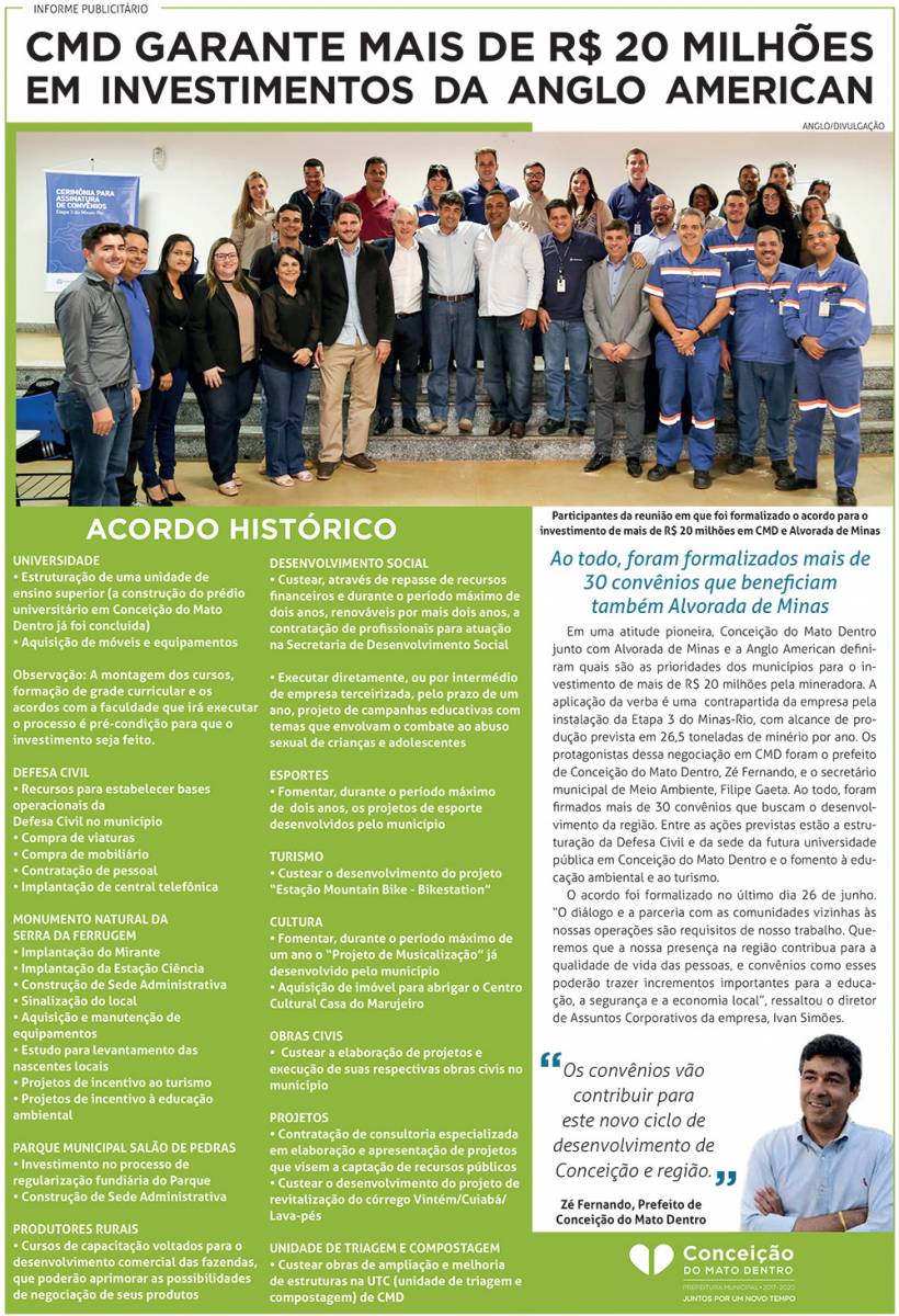 NOTÍCIAS > Política NOTÍCIAS > CIDADES > Conceição do Mato Dentro CMD garante mais de R$ 20 Milhões em investimentos da Anglo American 17.07.2018 Please enable JavaScript to view the comments powered by Disqus.