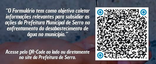 A Prefeitura Municipal de Serro informa à população que, devido à grave situação de desabastecimento de água em nosso município, foi disponibilizado um formulário online para que os cidadãos possam registrar informações sobre os problemas enfrentados em suas localidades.