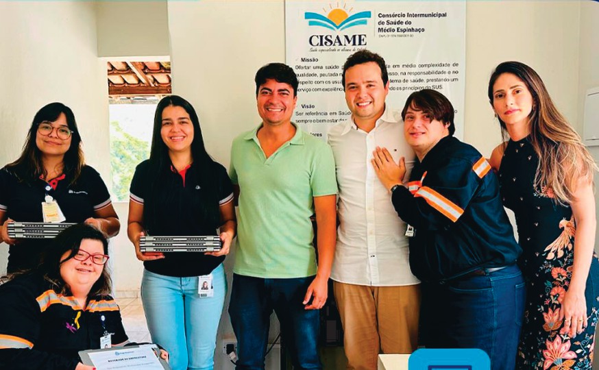 Prefeito de Alvorada de Minas, Danilo Cléssio e também Presidente do CISAME, , juntamente a Secretária Executiva, Srª Flávia Freitas Coelho, recebeu a doação de 10 (dez) notebooks semi-novos da ANGLO AMERICAN, para renovar os equipamentos de informática utilizados na prestação de serviços de saúde oferecidos aos municípios consorciados ao CISAME. A entrega foi realizada pela Analista de Relações Governamentais da ANGLO, Srª Bethânia Teixeira Mendes, na sede do consórcio. Neste ato, a Secretária Executiva também fez a entrega do planner institucional aos gestores e servidores do CISAME, com o intuito de contribuir com a valorização do planejamento e organização das rotinas de trabalho. Várias autoridades estiveram presentes no evento, fortalecendo o compromisso da equipe do CISAME em oferecer a todos uma saúde especializada de qualidade.